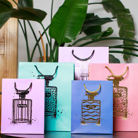 Modello di bottiglia di profumo sacchetto regalo di stampa a caldo Multi-colore negozio di abbigliamento di compleanno regalo sacchetto di carta all'ingrosso